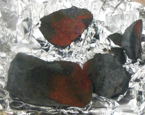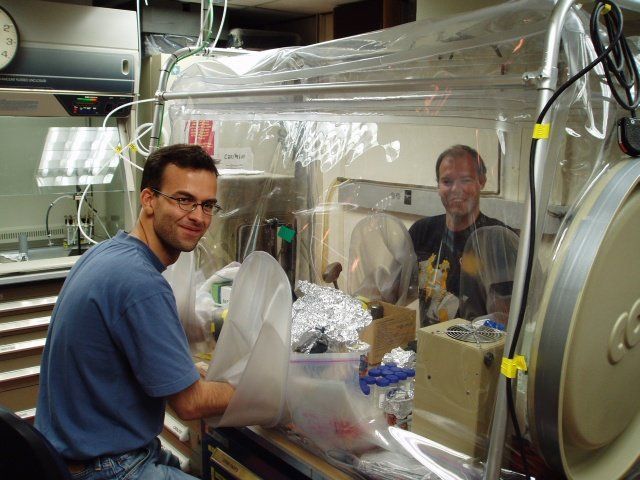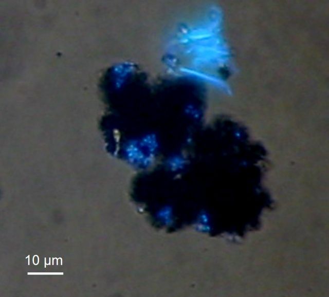 Das Bearbeiten der Kerne ist im wahrsten Sinne des Wortes der Hammer. Nachdem wir den Kern gesichtet haben, dürfen wir uns ein Stück Gestein aussuchen und bringen es dann in die Anaeroben-Kammer, wo ich die Proben dann mit Bjørn Steinsbu aus Bergen bearbeite. Wir zertrümmern das Stück dort mit Hammer und Meißel in etwa Golfball große Stücke. Diese werden dann in einem 2-Kilo-Eisen-Mörser mit einem Vorschlaghammer zu Schotter und Pulver zertrümmert - echt hard core. Die anderen Wissenschaftler, die ab und zu mal vorbei kommen meinen alle, daß sie vom mikrobiologischen Arbeiten immer eine andere Vorstellung gehabt haben. Das Gestein ist übrigens sehr interessant. Wenn die Proben mit dem ersten Schlag aufgebrochen werden, kann man sehr gut Adern und Poren erkennen, in denen sich Wasser befindet. Dort lebt auf jeden Fall etwas. Manchmal ist das Innere dieser Adern zum Beispiel durch ausgefälltes Eisenhydroxid (FeOH) rot gefärbt. Das etwas dort unten lebt konnte ich auch bereits an meinen angesetzten Kulturen sehen. Als ich nach fünf Tagen eine kleine Probe aus einem Röhrchen unter dem Mikroskop untersucht habe, konnte ich eindeutig Zellen von Bakterien erkennen. Das sind die kleinen blauen Kügelchen auf einer Flocke von Eisensulfid. Da diese Bakterien in einem Wachstumsmedium bei 70ºC angezogen wurden, ist es eher unwahrscheinlich, dass es sich hierbei um eine Verunreinigung durch den Bohrvorgang handelt. Ich habe somit die ersten "IODP-bugs" kultiviert. Die anderen Mikrobiologen haben etwas neidisch reagiert, zumal sie wesentlich mehr Kulturen als ich angesetzt haben. In einem ihrer vielen Ansätze ist sicher auch schon etwas gewachsen, ich habe aber als erster nachgeschaut ;-)