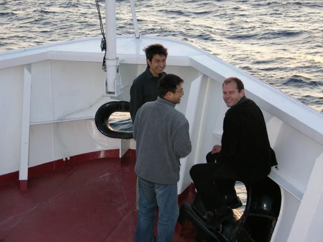 In meinem letzten Bericht habe ich ganz vergessen zu erwähnen, dass wir Besuch von einem Hubschrauber bekommen haben. Der hat ein paar fehlende Teile gebracht und unserem Hof-Fotografen Bill ermöglicht, die JOIDES Resolution aus der Luft zu fotografieren. Wir halten uns übrigens fast nur im vorderen Teil des Schiffs auf, da hinden die ganzen Bohrgestänge gelagert werden. Besonders schön ist es direkt am hochgezogenen Bug, da es dort etwas windgeschützt ist. Auf dem Foto sind von links Satoshi Nakagawa, Fumio Inagaki und ich zu sehen ...