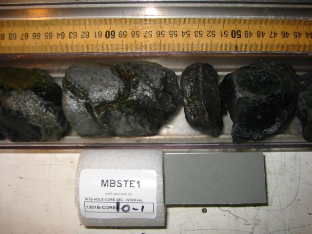 "Core on deck" war in der letzten Woche die wichtigste Ansage über die Bordlautsprecher. Das Ankommen der Bohrkerne hat in dieser Zeit den Arbeits- und Lebens-Rhythmus bestimmt. Zur Zeit bohren wir schon über 250 Meter tief in die ozeanische Kruste (530 mbsf = Meter unter dem Meeresboden). Die zeitliche Struktur ist dadurch völlig zusammen gebrochen. Je nachdem wann die Kerne kommen arbeite ich mal die Nacht durch oder in der Tagschicht. Es ist leider kaum abzuschätzen, wann der nächste Kern kommt. Die ersten kamen so im sechs-Stunden Takt. Das sind dann immer 10 Meter. Rauf kommen aber immer nur so etwa 2,5 Meter, weil ein Teil des Gesteins einfach zermahlen wird. Dann gab es zwischendurch immer mal wieder Probleme beim Bohren und die Mannschaft musste nach etwa 4 Metern aufhören, einmal sogar nach einem Meter. Zur Zeit beproben wir die Bohrkerne allerdings schon in größeren Intervallen, was die Sache mit dem Schlaf etwas erleichtert.