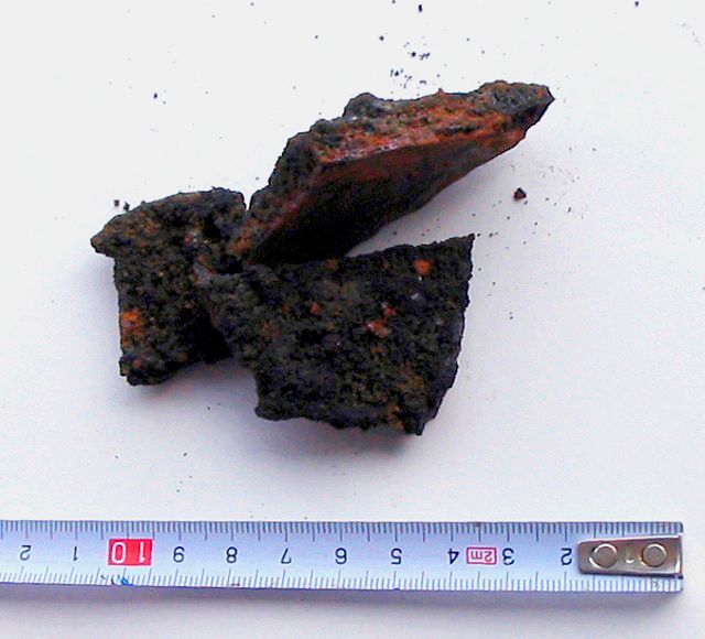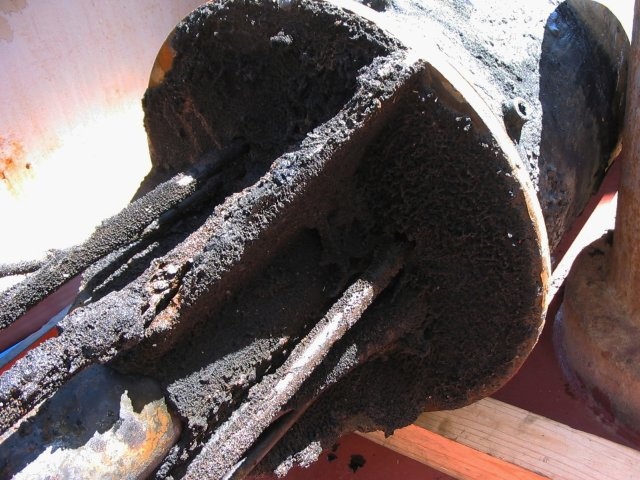 Am 03. August kam einer der alten CORKS nach oben. Bei diesem CORK wurden früher bereits mikrobiologische Experimente durchgeführt und die Ergebnisse in "Science" veröffentlicht [1]. Der CORK wurde vor etwa acht Jahren gesetzt und von uns gegen einen neuen CORK ausgetauscht. Da er nicht ganz dicht war hat sich mit der Zeit im Prinzip ein künstlicher hydrothermaler Schlot entwickelt. Der Biofilm (scaling), der sich entwickelt hat, war etwa 1-2 cm dick, hart wie Stein und besteht vor allem aus Verbindungen von Schwefel mit Eisen und anderen Metallen. Derartige Ablagerungen kann man auch in alten Rohrleitungen finden (will man aber nicht). Das Material war tiefschwarz und hat sich nach ein paar Stunden an der Luft rostrot verfärbt. Wir haben von dem frischen, schwarzen Material etwas abgeschlagen, dieses in Nährmedien überführt oder für spätere Untersuchungen eingefroren. In Satoshis Anreicherungen ist gleich am nächsten Tag etwas gewachsen.