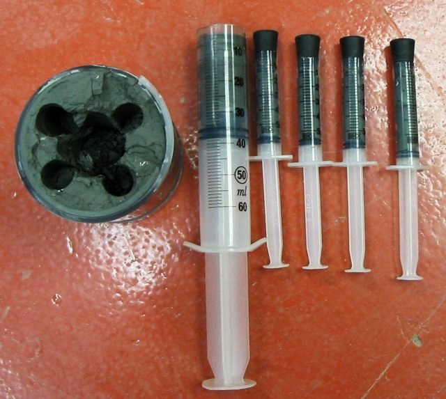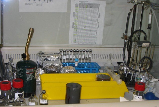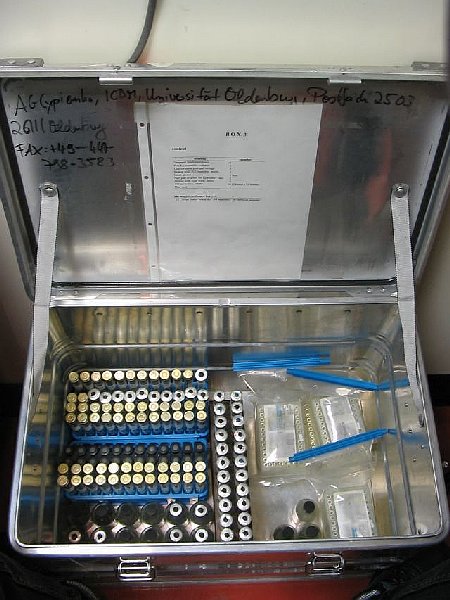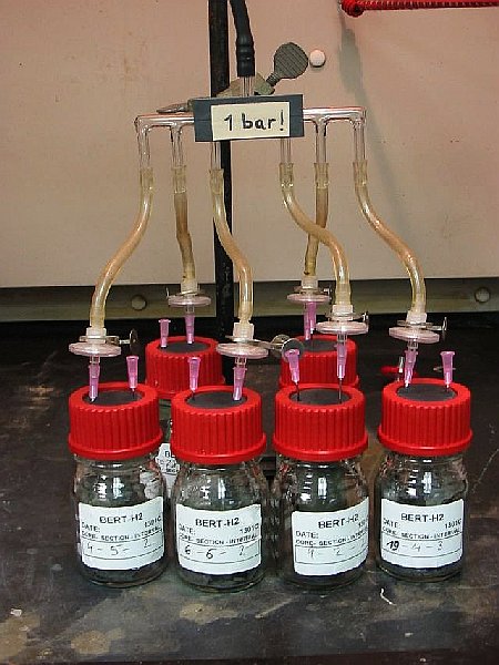 Ich selbst habe in elf Tiefenstufen jeweils vier 10 cm-Stücke (wrc) bekommen. Diese habe ich zunächst mit einer abgeschnittenen 50 ml Spritze beprobt, um an den unkontaminierten inneren Teil zu kommen. Von den vier whole round cores wurden drei Spritzen in eine 100 ml-Schottflasche mit Gummideckel überführt und begast, damit die Proben unter Sauerstoff-Abschluß in Oldenburg ankommen und je eine direkt zur späteren DNA-Extraktion eingefroren. Danach habe ich weitere Subproben mit einer 5 ml-Spritze entnommen und alles bei 4ºC gelagert.