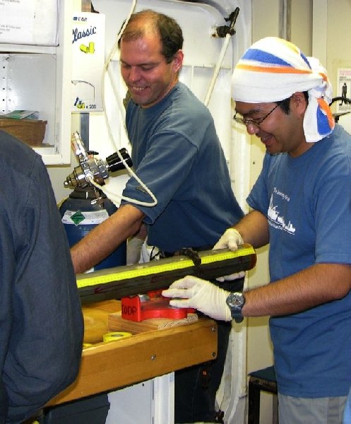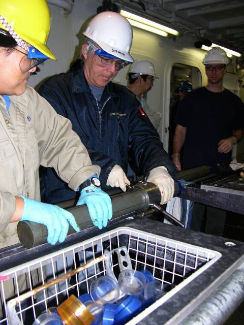 Das zum Protokoll. Praktisch sah das ganze so aus, dass ich gerade bei der Bearbeitung des zweiten whole round cores war, als über die Lautsprecher "core on deck" angesagt wurde. Dieser wurde von den anderen Mikrobiologen aufgeteilt und ich konnte weiter an meinen ersten Proben arbeiten. Da ich später in nicht in so hoher Auflösung beprobt habe, konnte ich nach meinem vierten Kern eine fünf Minuten Pause einlegen. Das war ca. um 10:00 Uhr morgens. Zu diesem Zeitpunkt war ich seit 24 Stunden wach und habe neun Stunden ununterbrochen an meinem Platz gesessen. Das ging dann bis 16:00 Uhr so weiter, bis sie eine Temperatursonde heruntergeschickt haben und danach einen größeren Anschnitt gebohrt haben ohne Kerne zu ziehen. Ich habe diese Pause genutzt um etwa drei Stunden zu schlafen. Ab 20:00 Uhr ging dann die Probenahme bis Sonntag Morgen für zwölf Stunden weiter. Nachdem ich alles abgearbeitet hatte war es 14:30 Uhr. Als ich dann nach zwölf Stunden Schlaf aufgewacht bin haben sich meine Finger angefühlt als hätte ich Gicht. Besonders in den letzten Kernen war das Sediment so hart, dass das Hineinpressen der Spritzen und später das Verschließen mit Gummistopfen fast unmöglich war. Den Rest der Woche waren wir dann mit den ersten Auswertungen beschäftigt, doch dazu mehr im nächsten und letzten Bericht.