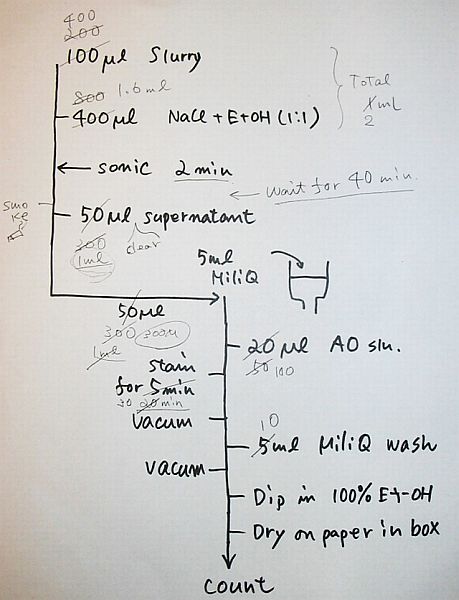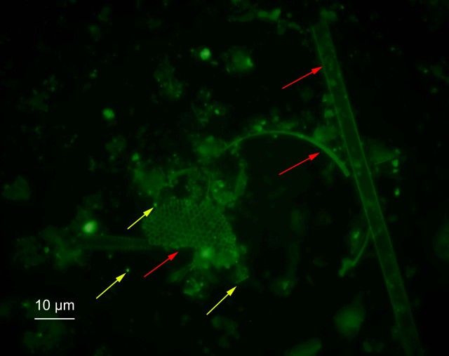 Dies ist nun also der achte und letzte Bericht meiner Reise und er hat ein "happy end". Dazu aber weiter unten. Wie bereits im siebten Bericht erwähnt, waren wir die Tage nach der Sediment-Probenahme mit ersten Auswertungen unserer Beute beschäftigt. Fumio und ich haben drei Nächte lang Bakterien gezählt um deren Verteilung in den verschiedenen Tiefen der Sedimentdecke zu bestimmen. Dazu mussten fixierte Proben homogenisiert, verdünnt und abfiltriert werden. In den ersten Proben waren sehr viele Trümmer von Diatomeen-Schalen (rot Pfeile) zu finden, was das Zählen der Bakterien (gelbe Pfeile) extrem erschwert hat. Nach etwas herumprobieren hatten wir dann das richtige Protokoll zusammengestellt und konnten ein sehr schönes Ergebnis produzieren. Zu der Zeit als wir unsere grün leuchtenden Punkte gezählt haben ging draußen der Meteoritenschauer der Perseiden herunter (10.-12. August). Wenn wir mal eine Pause an Deck eingelegt haben konnten sich unsere Augen also durch das Betrachten von weißen leuchtenden Punkten erholen. Ich glaube, ich habe instinktiv angefangen zu zählen?! Während wir noch unsere Ergebnisse produziert haben mussten wir bereits den Fahrtbericht schreiben, in den unsere Resultate einfließen sollten. Es ist schon etwas merkwürdig Daten zu diskutieren, die noch gar nicht produziert wurden.