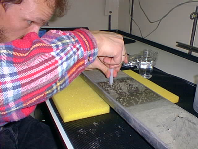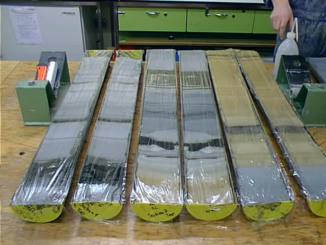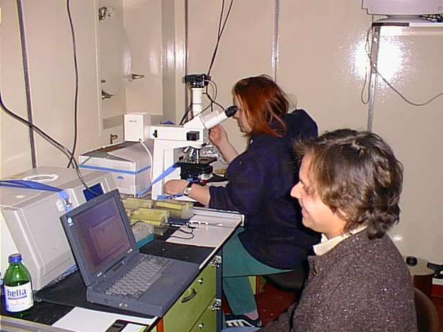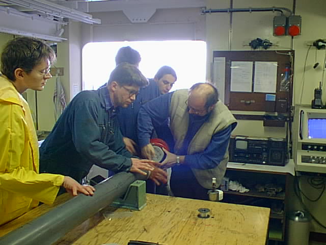 Ihr Lieben, ich gebe Euch einen kurzen Sonntagsbericht. Wir liegen auf Station suedwestlich von Kreta. Die Temperatur ist angenehm, vielleicht 12 °C. Das Meer ist ruhig, am Himmel sind nur wenige Wolken, die eher afrikanisch als mitteleuropaeisch anmuten. Nach drei meist trueben Tagen mit zahlreichen Gewittern wissen wir das wohl zu schaetzen. Die Seekrankheit ist schnell vergessen. Allerdings ist fuer die naechsten Tage wieder Sturm angesagt. Momentan liegt ueber uns nur ein Hochdruckeil zwischen zwei Tiefs. Gestern um fuenf gab es Sekt, als wir unsere wichtigste Probenahme erfolgreich abgeschlossen hatten. Denoch duerft Ihr sicher sein, dass weiterhin hart gearbeitet wird. So traf ich gestern, als ich morgens um fuenf aufstand, da wir an der naechsten Station eingetroffen waren, Andrea, die in der Nacht noch nicht geschlafen hatte. Jede Nacht wird unterbrochen, da die Inkubation irgendwelcher Ansaetze gestoppt werden muss. Anders als die meistens Geologen an Bord, die ganze Sedimentkerne oder Proben daraus fuer die Analyse zu Hause nehemen, haben wir verschiedene Versuche sofort durchzufuehren. Aber auch spaeter werden wir noch viel zu tun haben. Wir haben haben am Donnerstag und Freitag, eine mehr als 100 000 Jahre alte Sapropelschicht beproben koennen, die nicht ganz unseren Idealvorstellungen entsprach. Aber alle Techniken haben funktioniert. Es liess sich Aktivitaet mit den fluoreszierenden Substratanalogen und mit radioaktiven Isotopen nachweisen. Daraus koennt Ihr auch ersehen, dass die Geraete alle einsatzfaehig sind. Das Pipettieren der MPN-Reihen in der Sauerstoffreien Handschuh-Box ist allerdings sehr muehselig und zeitaufwendig. Die Sauerstoffmessung wird durch das viele Calciumcarbonat und diverse Partikel erschwert. Gestern nun haben wie einen ganzen (laengs halbierten) 6-Meter Kern aus 2100 m Tiefe zur Beprobung bekommen. Wir haben vier verschieden alte Sapopelschichten und vier Zwischenschichten untersucht bzw. Proben daraus aseptisch in verschiedene Ansaetze ueberfuehrt (Gesamtzellzahl mit Acridin-Orange, Lebendzellzahl (MPN), Gesamt-DNA, Biotrap-Extraktion, Aktivitaetsmessung mit drei Substratanalogen (MUF) und mit zwei radioaktiven Substraten (Glucose und Acetat), Kohlenstoffanalyse (TOC), Schwefelanalyse. Ausserdem hat Andrea ein ganzes Kernstueck eingefroren und regelmaessig Porenwasser gepresst. Besonders gut hat sich eine von Joerg ausgedachte Methode zum Herstellen kontaminationsfreier Oberflaechen bewaehrt. Die Stelle, die beprobt werden soll, wir mit Haushaltfolie abgedeckt, darauf kommt fuer 5 Minuten eine Schicht Trockeneis. Dann wird die Folie entfernt und die darunter gefrorene Schicht als Eisscholle abgehoben. Die weitere Analyse der Proben wir die naechsten beiden Tage in Anspruch nehmen. Dann erwarten wir Proben aus einem ganz andersartigen Standort. Das erst 1993 entdeckte Urania-Becken enthaelt in etwa 3500 m Tiefe eine konzentrierte Salzlauge mit drei- bis fuenffacher Mehrwasserkonzentration. Die Salze stammen aus ehemals eingetrocknetem Meersalz (Evaporiten) die ausgespuelt werden. In der Lauge gibt es keinen Sauerstoff aber Sulfid, das in den bisher untersuchten Proben nicht nachweisbar war. Hier wollen wir nicht nur Sediment- sondern auch Wasserproben analysieren. Liebe Gruesse Heribert