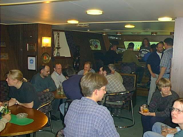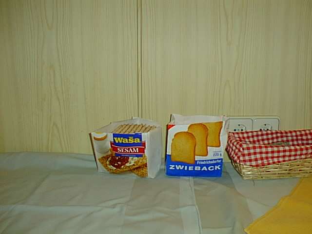 Liebe Landratten, leider muss ich berichten, dass unsere optimistische Wetterprognose noch nicht eingetroffen ist. Nachdem wir die Strasse zwischen Korsika und Sardinien heute bei Sonnenaufgang passiert hatten, frischte der Wind auf 7 bis 8 Windstaerken auf. Da er genau von der Seite kommt, rollt das Schiff heftig. In Momenten starker Schraeglage hoert man ein Gejohle und Geschepper durch das ganze Schiff. Koffer und Stuehle poltern umher. Meine Schreibtischlampe ist trotz gummierten Metallfusses vom Tisch geflogen. Die Stewards giessen in der Kantine Wasser auf die Tischtuecher, damit die Teller nicht rutschen. Dennoch fliegt das Besteck und manches Glas.... Joerg ward noch nicht gesehen. Henrik versorgt ihn mit Zwieback, Apfel und Wasser. Den andern geht's wohl gut. Allerdings ist es sehr anstrengend, auf den Beinen zu bleiben. Wir koennen heilfroh sein, dass unsere empfindlichen Experimente in der letzten Nacht abgeschlossen wurden.