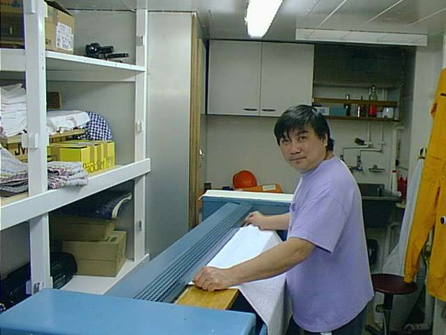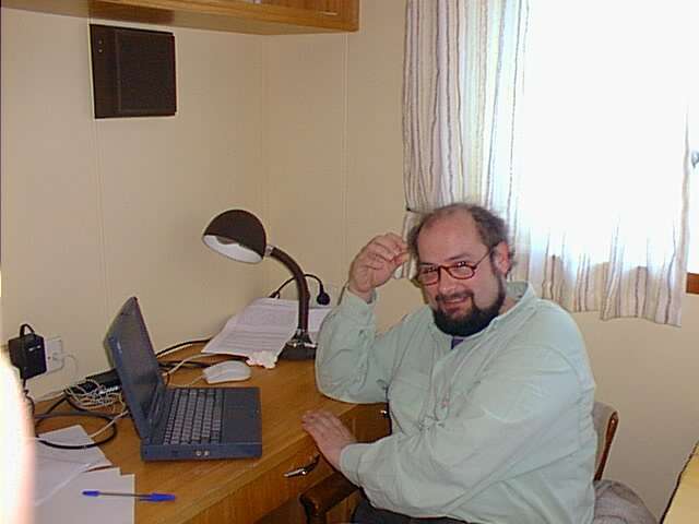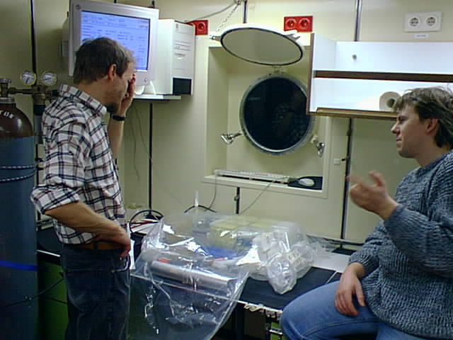 Ihr Lieben, endlich einmal Nachricht aus dem Labor in Oldenburg! Wir haben hier weder Fernsehen noch Radio, nur einmal taeglich einen zweiseitigen Ausdruck mit DPA-Meldungen in der Kantine. Immerhin wussten wir schon, dass Ihr es deutlich kuehler habt als wir. Und wir bedauern Euch darum sehr. Inzwischen haben wir unsere Position suedlich von Sizilien verlassen und dampfen Richtung Sardinien und Korsika. Es war schon ein schoenes Gefuehl, nachts aus der Koje auf das Meer zu schauen und die Lichter Siziliens vorueberziehen zu sehen. Tagsueber konnte man sogar aus ca. 60 km Entfernung den schneebedeckten Aetna aus dem Dunst ragen sehen. Das Wetter ist nicht so stuermisch geworden wie vorhergesagt. Es ist aber truebe, nicht kalt und soll Windstaerke 6 bis 7 geben. Unsere Probenahmen sind nun weitgehend und sehr erfolgreich abgeschlossen. Die meisten Sachen sind leer oder verbraucht. Nur Andrea sammelt noch Oberflaechenproben, und ich messe, wann immer moeglich, Sauerstoffprofile in der Sedimentoberflaeche. Marco ist bei der Auswertung der MUF-Experimente. Joerg und Henrik haben noch eine grosse Serie 14C-Versuche angesetzt, die in dieser Nacht auslaeuft. Dann muessen die vielen Acridin-Orange-Proben ausgezaehlt werden. Grossen Aerger gab es damit, dass unsere Vorgaenger auf dem Schiff radioaktive Proben uebriggelassen haben, die Andrea und Joerg in kleinere Behaeltnisse umfuellen mussten. Wie diese Sachen nach Hause kommen werden, weiss niemand nicht genau. Das gilt leider auch fuer unsere 14C-Proben. Wir werden noch einiges zu erzaehlen haben.... In der letzten Woche muessen ein Fahrtberichte geschrieben und der DFG-Antrag modifiziert werden. Ansonsten hat man sich an das Schiffsleben gewoehnt, empfindet das leichte Schaukeln als angenehm. Alle haben bei 'Max', dem Chinesen, ihre Waesche waschen lassen. Er buegelt vorzueglich, so dass ich an Bord deutlich gepflegter umherlaufe als in der Uni. Mit der digitalen Kamera habe ich bereits vielleicht 150 Bilder geschossen und sie an einem Computer im Rechnerraum allen zur Verfuegung gestellt. Da herrscht reger Betrieb. Ihr werdet sie dann auch noch zu sehen bekommen. Soviel fuer heute. Herzliche Gruesse von uns allen Euer Heribert _______________________________________________________