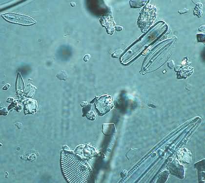 Präparierte Schalen von Kieselalgen aus Wattsediment im Lichtmikroskop.