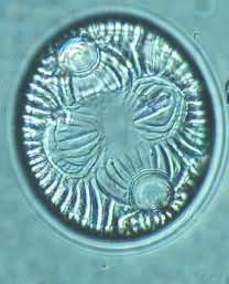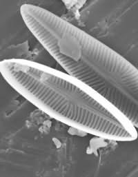 Schalen der zentrischen Diatomee Auliscus (links) und der pennaten Diatomee Navicula (rechts). Bei Navicula ist eine in der Mitte der Längsachse verlaufende