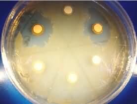 Teststamms (als trüber Bakterienrasen erkennbar) hemmen.