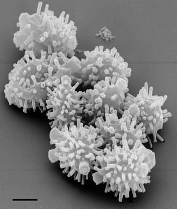 Spores under the scanning electron microscope. Bar = 2 µm