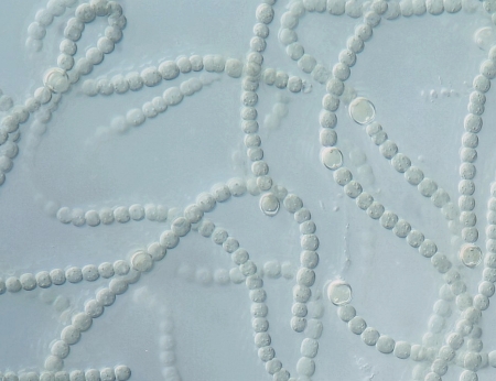 At high magnification two different cell types become visible. The larger cells are called heterocysts ("different cells"). They harbour enzymes that transform air nitrogen into amino groups or organic molecules.